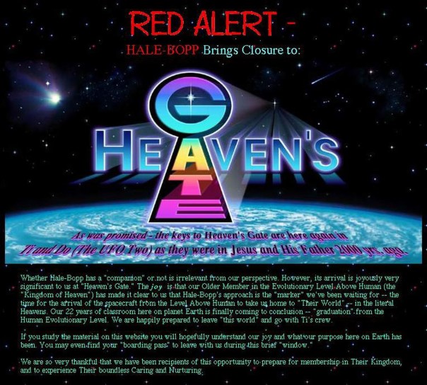 “The joy is that our Older Member in the Evolutionary Level Above Human (the ‘Kingdom of Heaven’) has made it clear to us that Hale-Bopp’s approach is the ‘marker’ we’ve been waiting for — the time for the arrival of the spacecraft from the Level Above Human to take us home to ‘Their World’ — in the literal Heavens,” the Heaven’s Gate website said. “Our 22 years of classroom here on planet Earth is finally coming to conclusion — ‘graduation’ from the Human Evolutionary Level. We are happily prepared to leave ‘this world’ and go with Ti’s crew.”