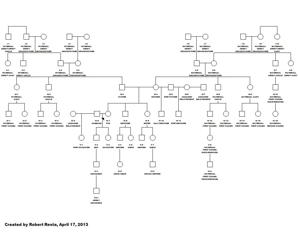Below I have created a generic pedigree that illustrates the most common familial relationships in the kinship system of the modern Western English-speaking world. The pedigree undoubtedly contains errors and omissions. So, in the spirit of crowd sourcing, I encourage my fellow pedigree wonks to scrutinize it and report mistakes, mislabelings, missing relatives, and thoughtful commentary in the Comments section below (this would also be a great discussion topic for a few hours of a genetic counseling student seminar).