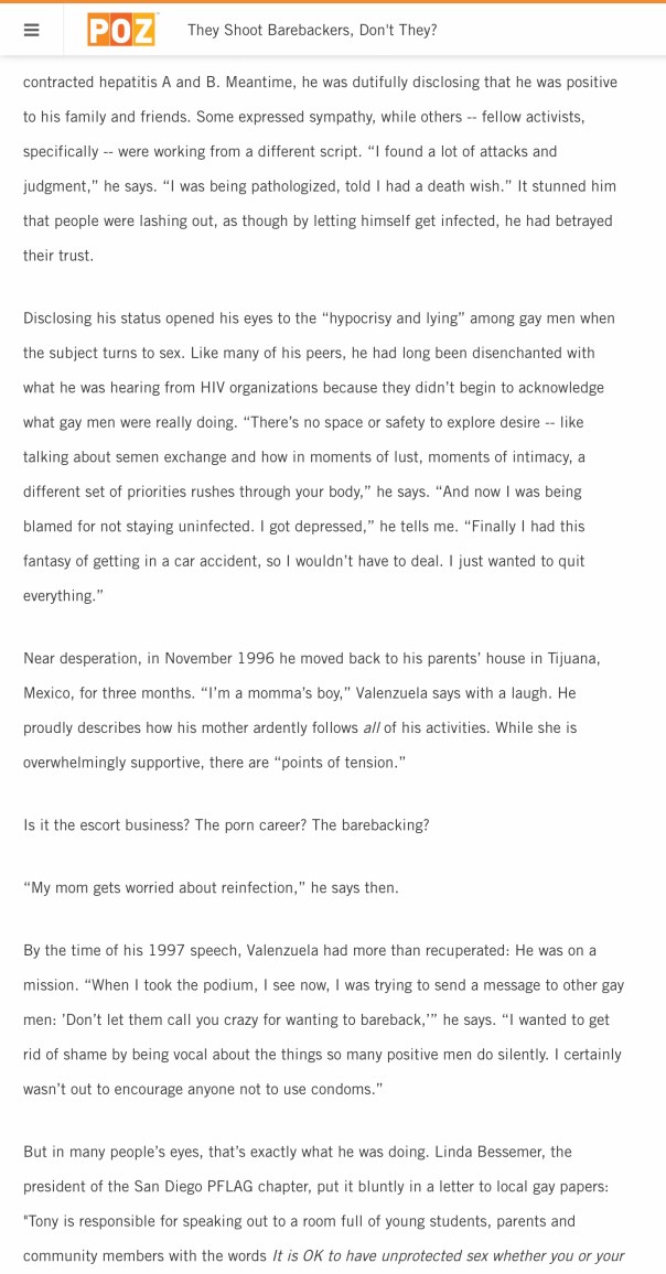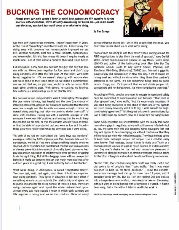 Below is my original article with the articles now included. At the end is letters published regarding the “Bucking the Condomocracy” article, and a more recent article on the same subject. My bug chasing article can be found on this blog simply by searching for “barebacking”.