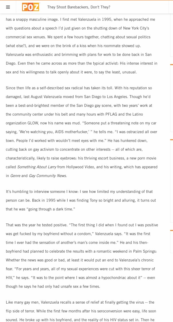 Activist and writer Tony Valenzuela became a community pariah when he wrote a piece in 1995 about being a young man living with HIV who had condomless sex with his boyfriend. He thumbed his nose at his detractors when he appeared naked on a horse for an infamous 1999 POZ Magazine cover (“They Shoot Barebackers, Don’t They?”) in which he discussed how the controversy angered and confused him. Valenzuela’s personal character was questioned and his professional life was derailed for years.