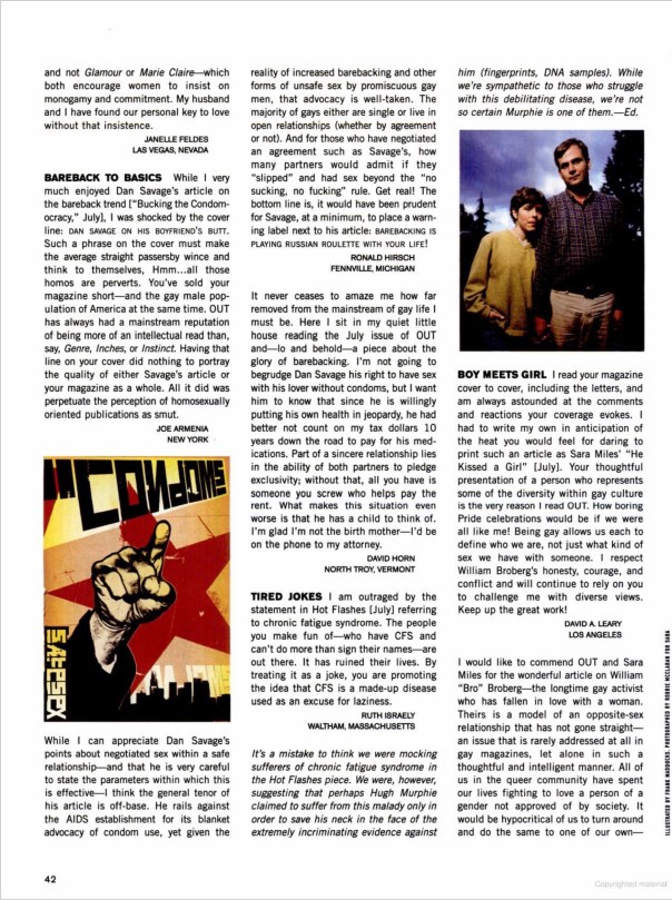 LETTERS PUBLISHED IN “OUT” MAGAZINE SEPTEMBER 1999, VOL 8, NO. 3 IN RESPONSE TO “BUCKING THE CONDOMOCRACY”.