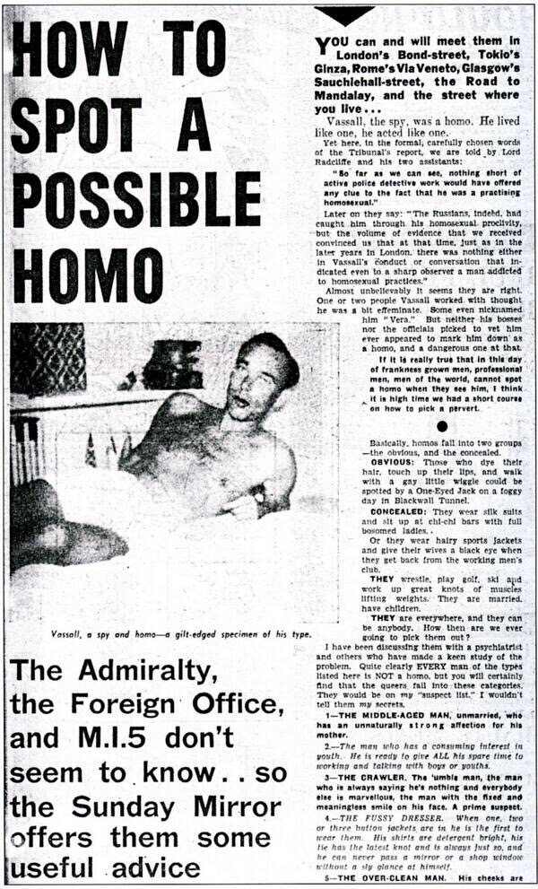 How do you pick out a gay man in a crowd? According to Dr La Forest Potter’s Strange Loves, published in 1933, “the average homosexual” differs from “ordinary men” in 10 easily identifiable ways: he has “large, easily aroused nipples”, “a mincing walk”, “sloped and rounded shoulders”, “thick, luxuriant hair”, “a hairless chest”, “soft, delicate skin” free of manly spots, a lack of “dogmatic energy”, a “peculiar swinging motion of the hips” due to anatomical defects in the spine and pelvis, “a considerable deposit of fat in the region of hips, breasts and thighs”, and – the clinching clue – “feminine buttocks”.