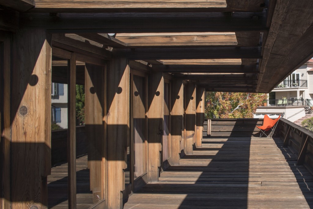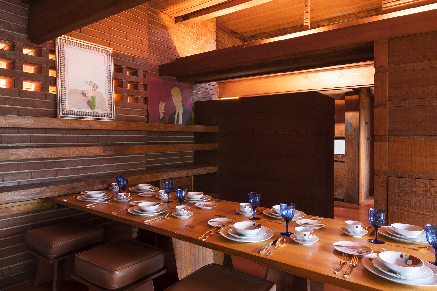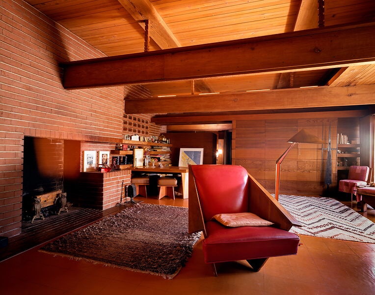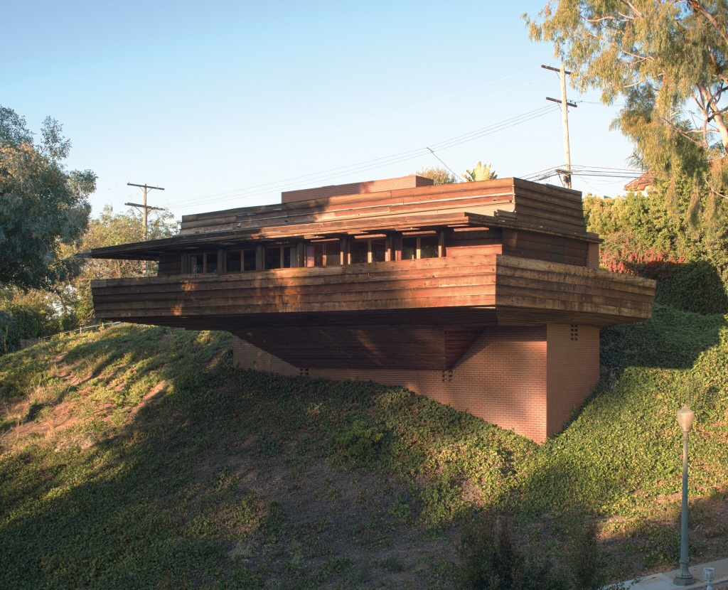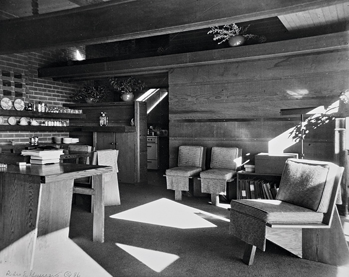 Built of steel, concrete, brick and wood, the house is approached from the west at the rear just off the carport at the top of the hill. Visitors could either proceed around the encircling deck to enter through the living room on the eastern side or, as most did, through the small kitchen to the west. With less square footage than the Usonians in the Middle West, the house contains a relatively large living-dining room, two small bedrooms, and one bath on the main level. Tiny stairs lead up to the roof deck and down into the windowless basement, which Bridges used as a dark room and studio. In 1939, Wright had deputized his recent Taliesin disciple, John Lautner, to complete final details of the design and to supervise construction. Both Wright and Lautner created specially designed furniture and other accouterments, such as lamps. Small cabinet spaces were cleverly concealed behind fold-out wall panels. Larson and Bridges would also enjoy pointing out various movie treasures they had acquired over the years such as the actual wrench used by Charlie Chaplin in Modern Times (1936).