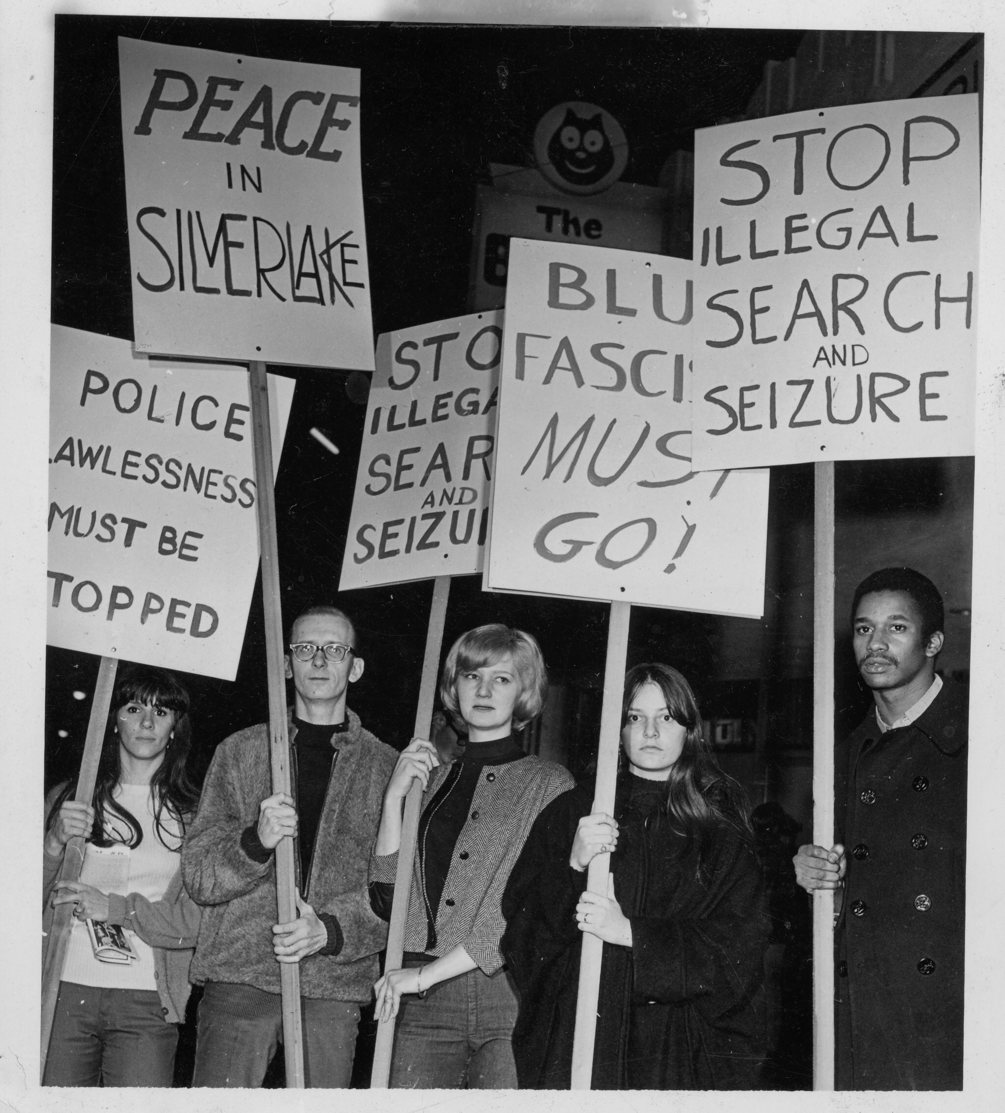 Other Silver Lake gay bars, including New Faces, a few doors down, were targeted the same evening. Two years before the Stonewall uprising, more than 200 people came together outside the Black Cat for one of the earliest U.S. LGBTQ-rights demonstrations. Picketers gathered on February 11, 1967, to peacefully protest the police raids that had been conducted weeks before. Alexei Romanoff, a former owner of New Faces, describes the Black Cat demonstration as a turning point. During a time in which homosexuality was illegal in most states, LGBTQ people developed elaborate codes and survival strategies to avoid arrest. But that February night, Romanoff says, the community stood up and fought back.