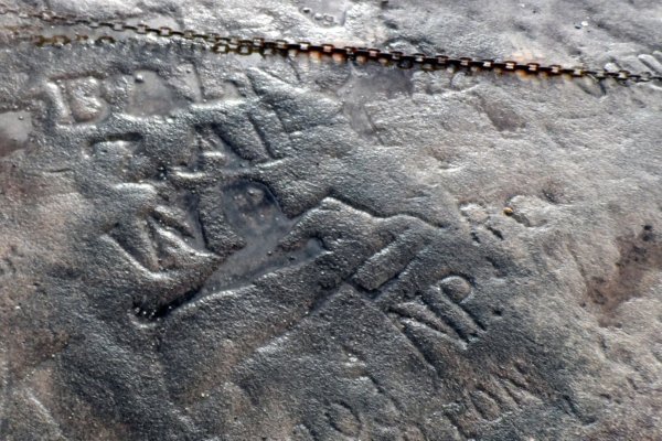 The engraving shows two sailing ships in profile. Around and over them are a series of letters – BALN ZAIH – and other engravings such as a cross within a circle. They are engraved into the surface of the sandstone. They are oriented to be read from the west.
