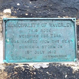 “Municipality of Waverley. This rock weighing 235 tons was washed from the sea during a storm on 15 July 1912. January 1933. J. S. MacKinnon. Town Clerk.”