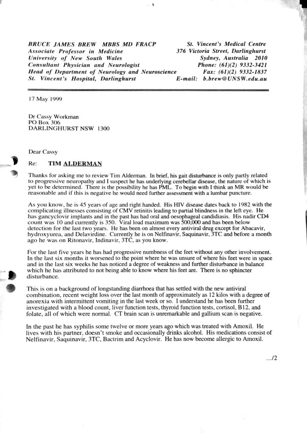I was shuffled onto the pension, and given rent subsidised housing by DOH (Department of Housing). The subsidy seemed like a good idea at the time. After all, weren’t we all eventually going to be killed by the Big H, so no one would be on it for that long? Famous last words! My alcohol consumption and chain smoking increased, if that was possible! Was losing weight at an alarming rate, and naturally no one noticed because I took to wearing baggy clothes to disguise it. Nothing quite like being delusional. Moved from Darlinghurst to Bondi. Nothing like moving away from the scene to help your health…not! Collapsed in the street, and admitted to St Vincent’s not with PCP as suspected but a collapsed lung. Two weeks later and a change of female GP’s saw me back in the doctor’s rooms while she read my hospital discharge report. Had they tested me for CMV retinitis? No! Was I having trouble with my vision? Yes, but I do wear glasses. Guess what? We’re sending you for a little holiday at Prince Henry Hospital (now closed). I was a little bit sick. Chronic CMV retinitis, chronic candida, chronic anemia, had 10 CD4 cells and weighed 48 kgs. Mmm, prognosis was not good. Well, it had been a good life. I was certainly joining a band of party people. But no! Life hadn’t finished with me yet. Protease Inhibitors had come along at an auspicious time, and within a fortnight I had been stolen from the arms of death. Mind you, that fortnight had been no picnic. Ganciclovir injections into the eye, Deca-Durabolin injections to help put weight back on, blood transfusions, and enough finger prick blood readings to last me the rest of my life. And the problems had just started for this return-to-lifer. Not dying when you are supposed to really fucks up your head space.