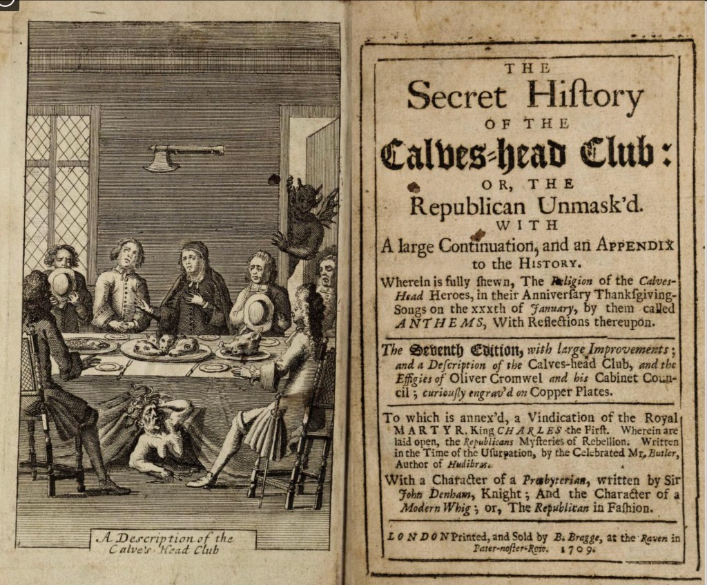 In 1735, the gentlemen got a little carried away and chucked a bloodied calve’s head out of the tavern window. According to an account titled the Secret History of the Calves’ Head Club or the Republican unmasked, this act – on the anniversary of the king’s beheading, provoked a riot. At least that was the widely circulated version of events.