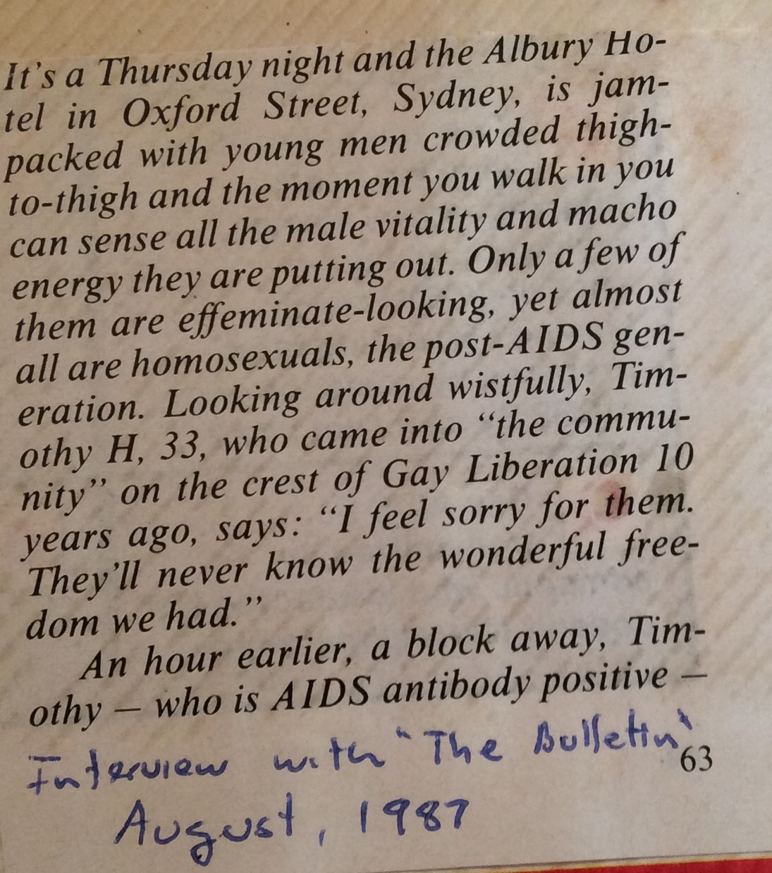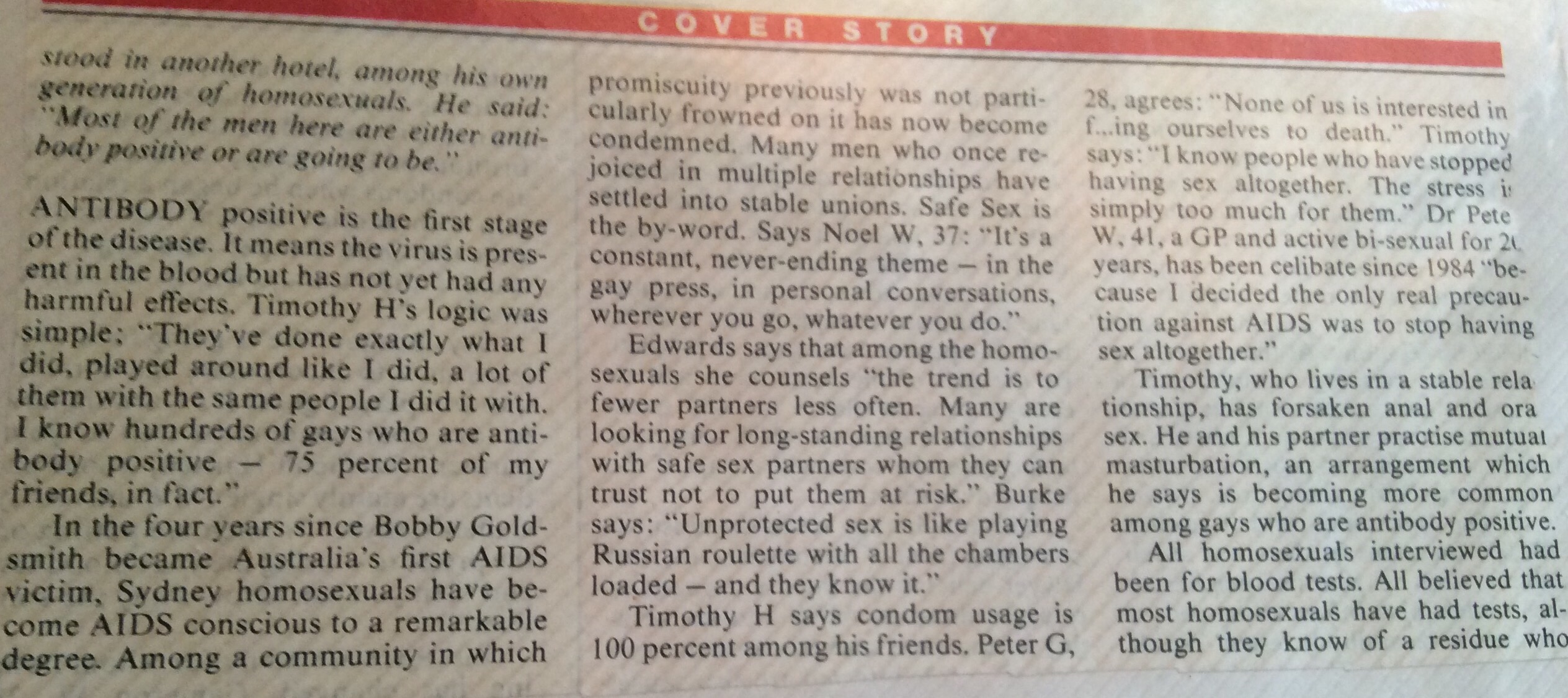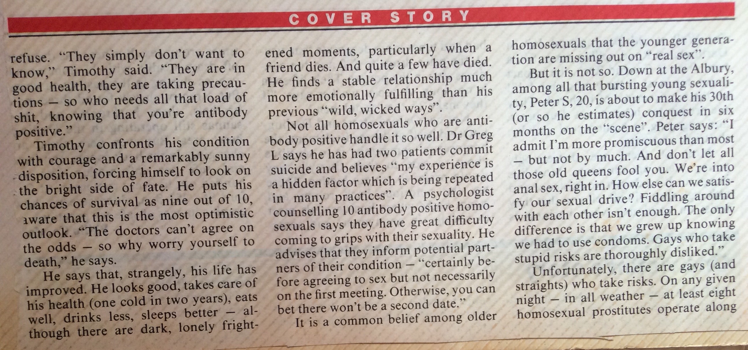 So what was it really like in 1982 to be reading snippets in our local gay press about this mysterious illness in The States that seemed to be targeting gay men who frequented the saunas, and quickly killing them? Well, cynicism and disbelief to start with, and the surety that within a short period of time they would find an antibiotic to clear up yet another STD. Soon the snippets were to become columns, then pages as the mysterious and deadly illness leapt from the shores of America and found its way here.