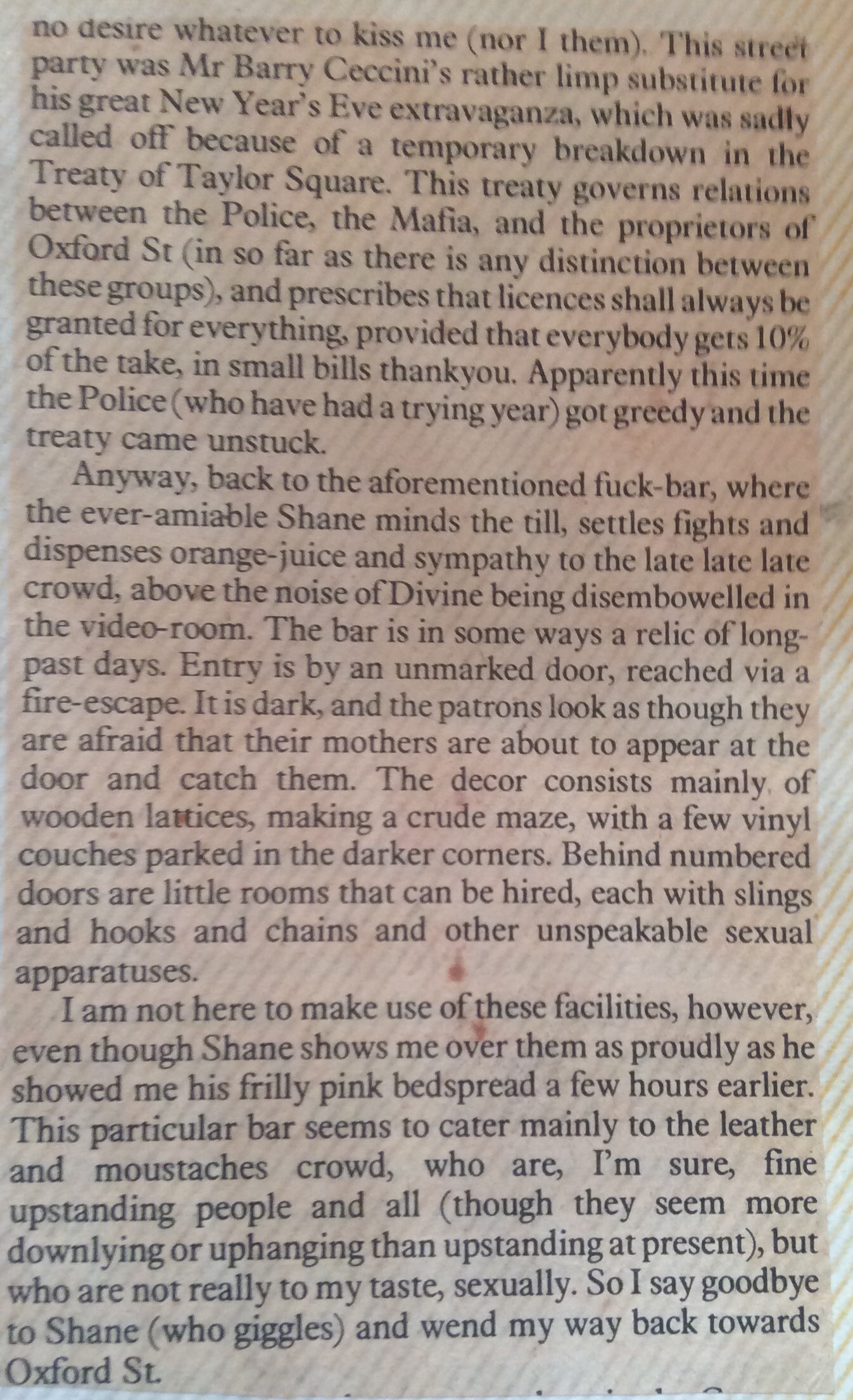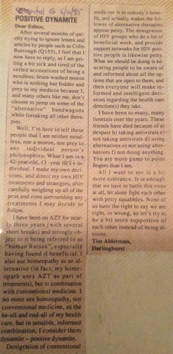 Despite its reputation for being human Ratsac (the Concorde Study in France named it such, after conducting an unethical trial; turns out they were correct!) I started taking AZT when my CD4 count started to take a dive. Hard work, long hours, heavy drinking, chain smoking, a shit diet and emotional turmoil didn’t help. Pub culture became lifestyle. Did several drug trials – D4T, which was sort of successful, though the same class of drug as AZT. Also p24 VLP (Very Light Protein) which proposed that stimulating the p24 antigen may help control HIV. Total waste of my time. It did nothing. We started alternating drugs – 6 months on AZT, 6 on D4T, 6 on DDI, 6 on DDC. Perversely it seemed to keep the wolf from the door. Dosage was huge. Everyone on it ended up with kidney problems and peripheral neuropathy. Prophylactics added to the drug burden. In the meantime there was no HIV dental service and our teeth rotted or fell out due to bouts of candida. I left work in 1993 after being seriously knocked around by viral pneumonia which should have killed me…but didn’t.