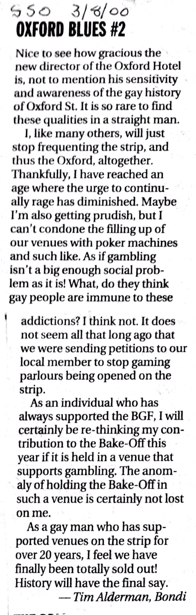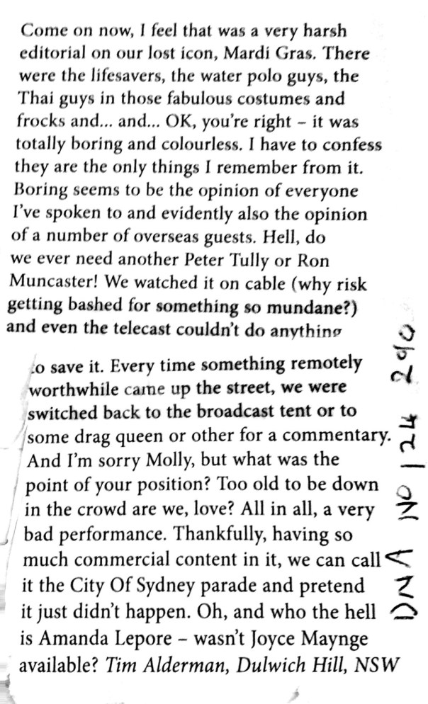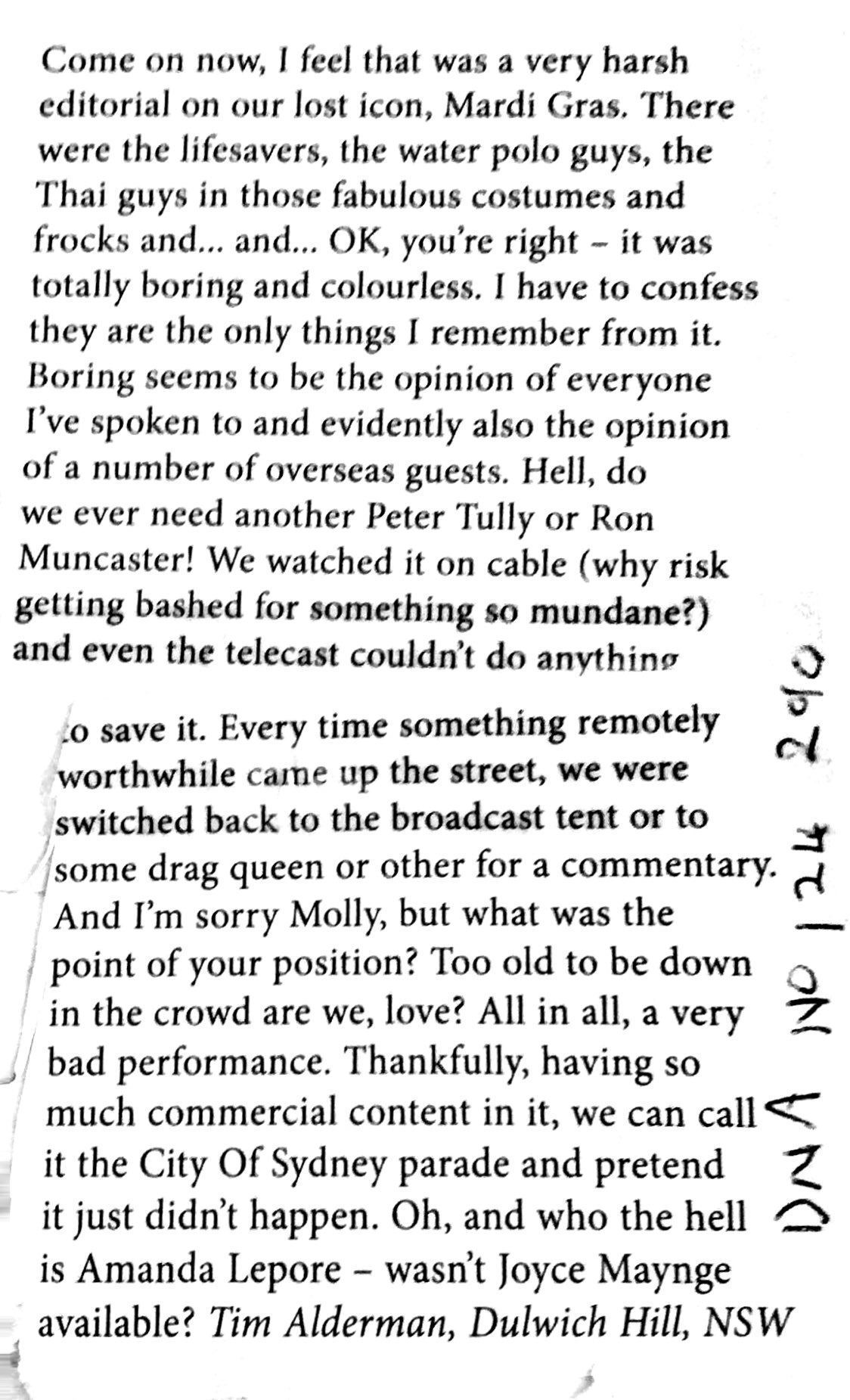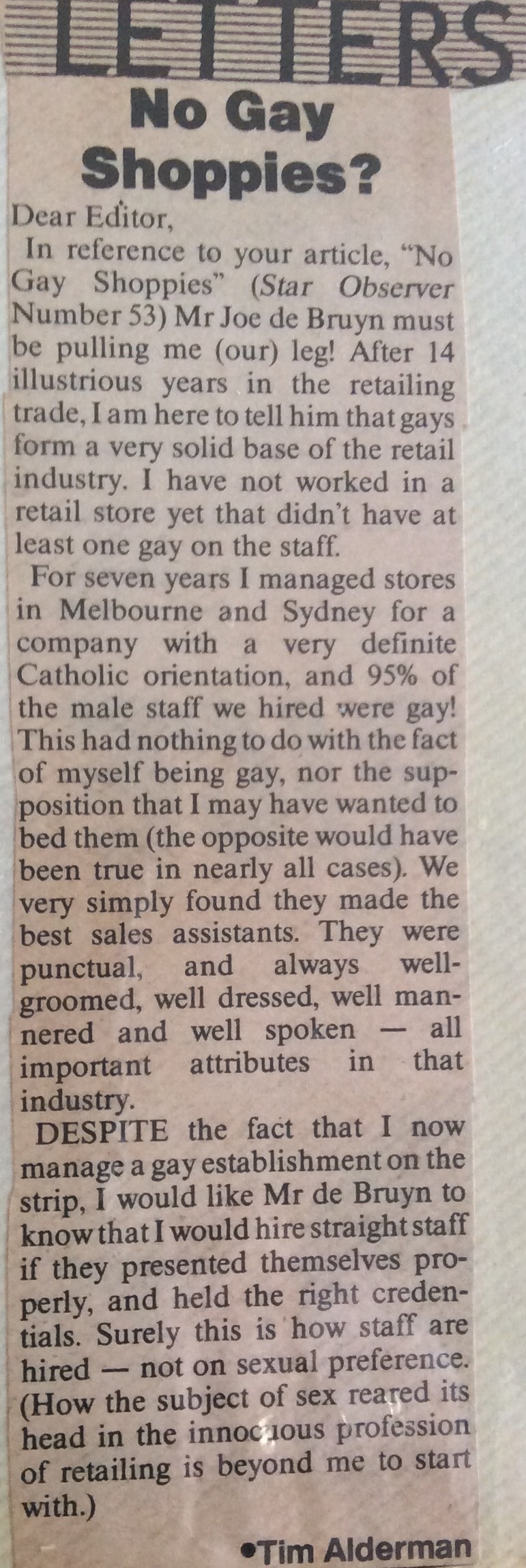 Our response was mixed. The first recorded case of HIV at home was 1982, and the first death in 1983. We had our usual ratbags who yelled and screamed about God’s vengeance on the evil, sick and perverted gay lifestyle (obviously a different God to the compassionate, all-forgiving one that I had heard about), the advocates of hate who demanded quarantine for all infected persons, and those who either quietly or vocally wished that we would all die or just go away. Not that easy folks!