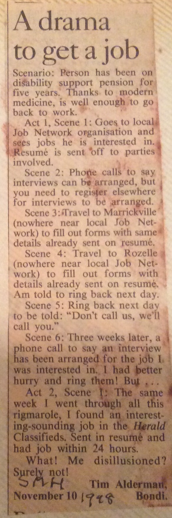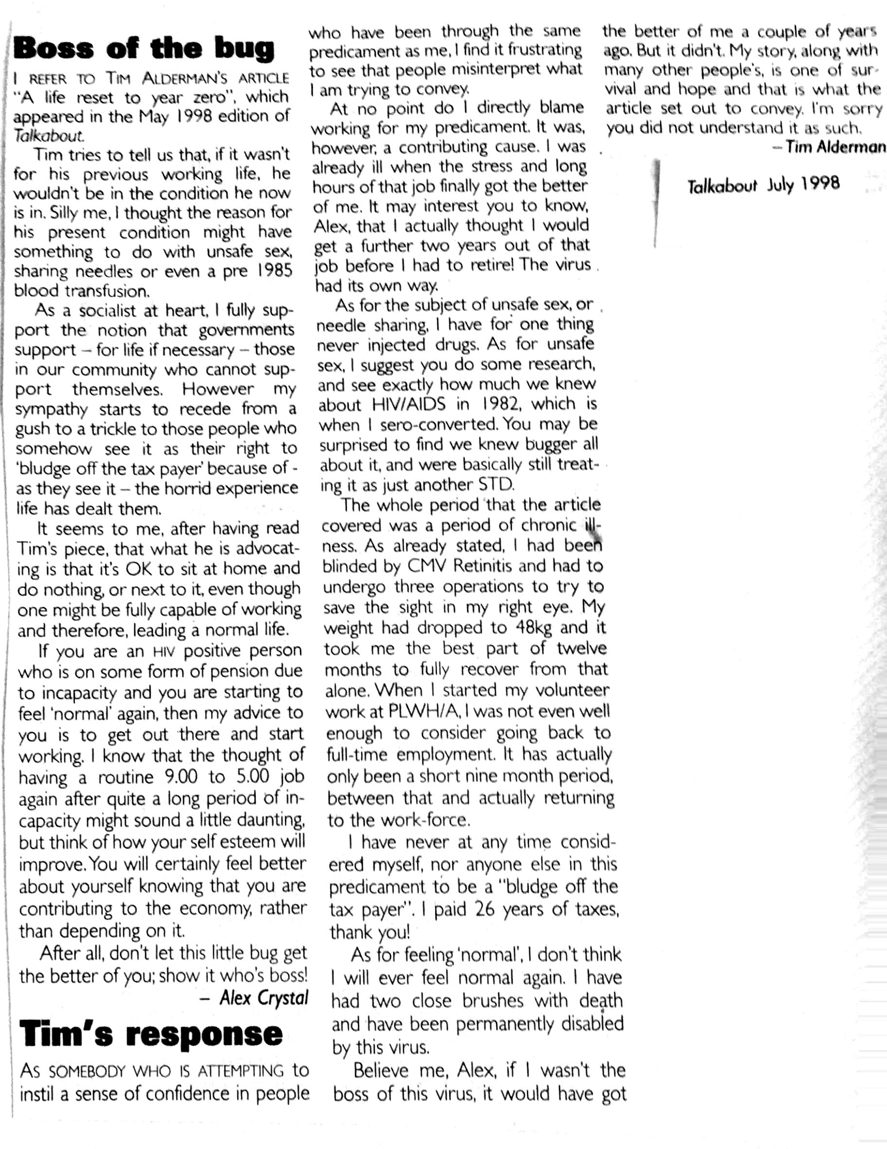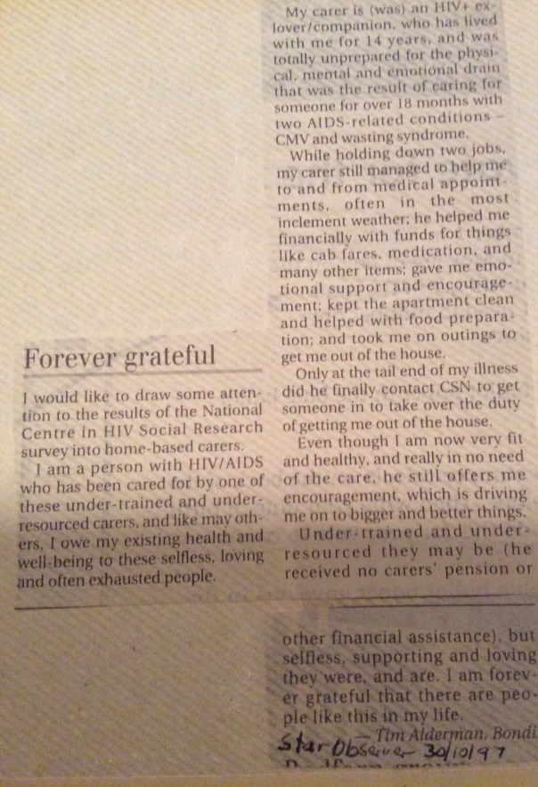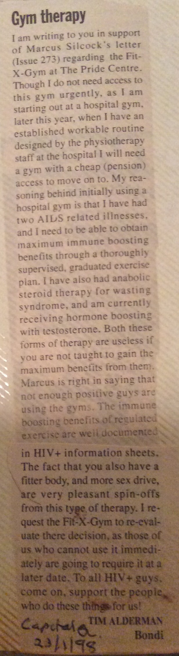So started the next round of therapies. Peer Support groups; counselors; Caleo (Greek word which means “To Stick”, a treatment management group who help you maintain the impetus to take the billion pills a day (I was taking over 360 pills a week – anti-retrovirals, prophylactics, and pills to control side effects – at one stage) we were taking); clinics; dental care (now up and running); volunteer work (to keep one sane). What started out as volunteer work at the then PLWHA (NSW) Inc (now Positive Life) turned into paid employment as a research assistant. I started writing for “Talkabout” magazine, joined the Positive Speakers Bureau, and learnt to use a computer. A couple of stints back in full-time employment made me realise that big changes needed to be made with my life. By this time my health was pretty well back together. A couple of nights out pushed home just how few people I knew, however did lead to meeting my current (now ex) partner. A brief encounter with Indinivir sludge in my kidneys (which involved having a stent inserted then removed) also made me aware that for HIV+ people the unexpected can happen at any time. Yet another change of doctor. Self-empowerment had become an important issue, and I wanted a say in my health management, as distinct from being dictated to. Big changes were about to happen.