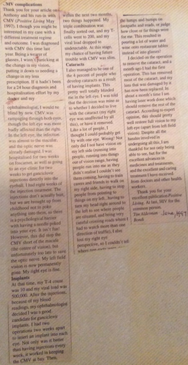 Like many, I went on every drug or alternative trial that came my way. There are those who have described us guinea pigs as brave, or “heroes”, but we certainly didn’t feel like that at the time, despite it being a very selfless act. The thinking at such a desperate time was that…well, if it works for me, the benefit will flow onto everyone else! But there were, in the early days at least, more failures than successes. D4T:FAILURE…caused anaemia; P24-VLP:FAILURE…was hoped it would boost the p24 antigen – it did nothing: Goat Serum:FAILURE…though I did get a very scary skin rash from it; Vitrasert Implants: FAILURE…though due more to HAART eradicating the scourge of CMV retinitis. Were intended to leach Ganciclovir into the eye over a 9 month period, thus eliminating the need to have it injected into the eye regularly. Two minor operations to insert them, with an initial estimate of a 4% chance of developing cataracts. Turned out to be a 100% chance, thus further operations to remove the cataracts. Fun, baby!