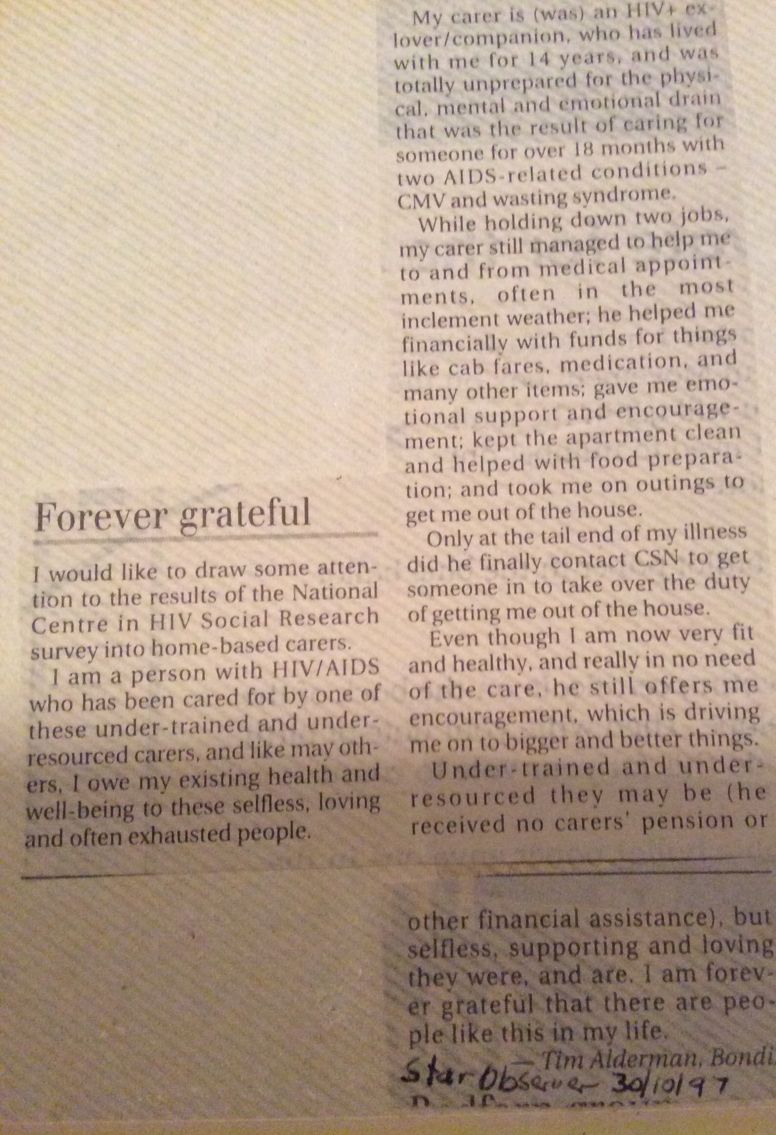 I stayed in Sydney only for as long as I needed to be there. I hated it! A cold, over-populated, rude city. Within 12-months, we…I include my housemate, who also came with me…moved to the Central Coast, where life is quiet, and more civilised. Life goes on…I’ve lived long enough now to start seeing the truth finally being told about many aspects of HIV – the high toxicity and ongoing problems caused by AZT, exploitation by Big Pharma, misuse of funding, unresearched and often inaccurate advice on therapies and treatments, the rushing through of many treatments that proved detrimental to those who took them. It’s time to clear the air, and take the sentimentality out of an often rose-coloured glasses view of the epidemic.