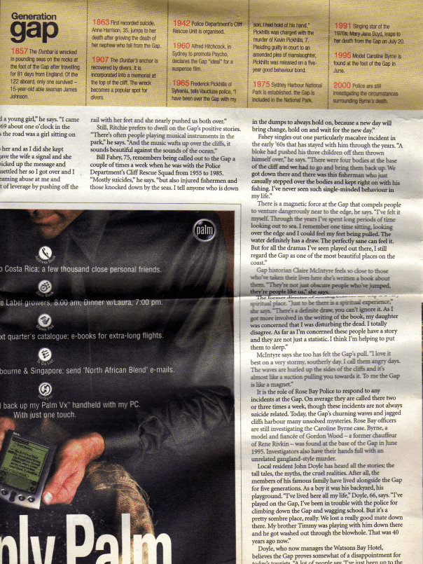 “Mind The Gap”, Sunday Life supplement, Sunday Herald, June 2000, Page 8. Written by Glen Williams, Photographs by Steve Baccon. Bylined “Generation Gap”, a timeline of events, it says “1965: Frederick Pickhills of Sylvania tells Vaucluse police “I have been over The Gap with my son. I had hold of his hand.”