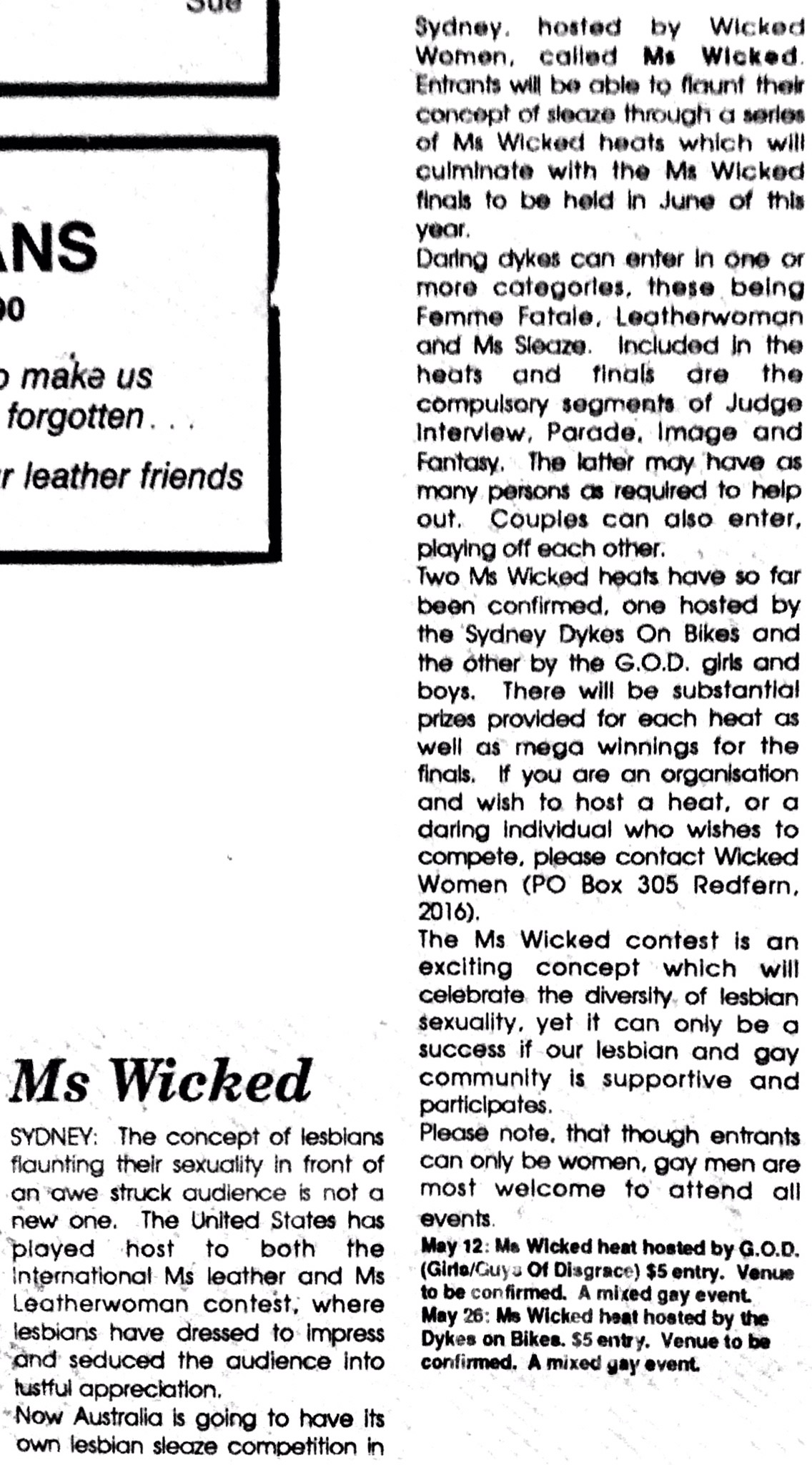 Less obvious than its challenge to existing ideas around lesbian sexual practices, was the role Wicked Women played in building lesbian community. Its classified personals included the expected: “23 Year Old into leather, looking for experienced S/M dyke to worship”,(175) but were also used by a range of lesbians to seek partners, such as “slim 22 yr old, strawberry blonde, desperately searching for my dark earth mother”. The magazine ran contact details for local lesbian social groups, and advertisements for Sydney’s Gay and Lesbian Mardi Gras. Wicked Women organised what became a popular annual event, the Ms Wicked competition “in which lesbians stripped and performed sexual acts for enthusiastic all-female audiences”.(176) More than 500 attended a Melbourne heat in 1991.(177) Wicked Women organised a Mardi Gras dance party Be Wicked that was raided in the early hours by police with the patrons “herded out”,(178) and Girl Beat at the gay male sex-on-site venue The Den.(179)